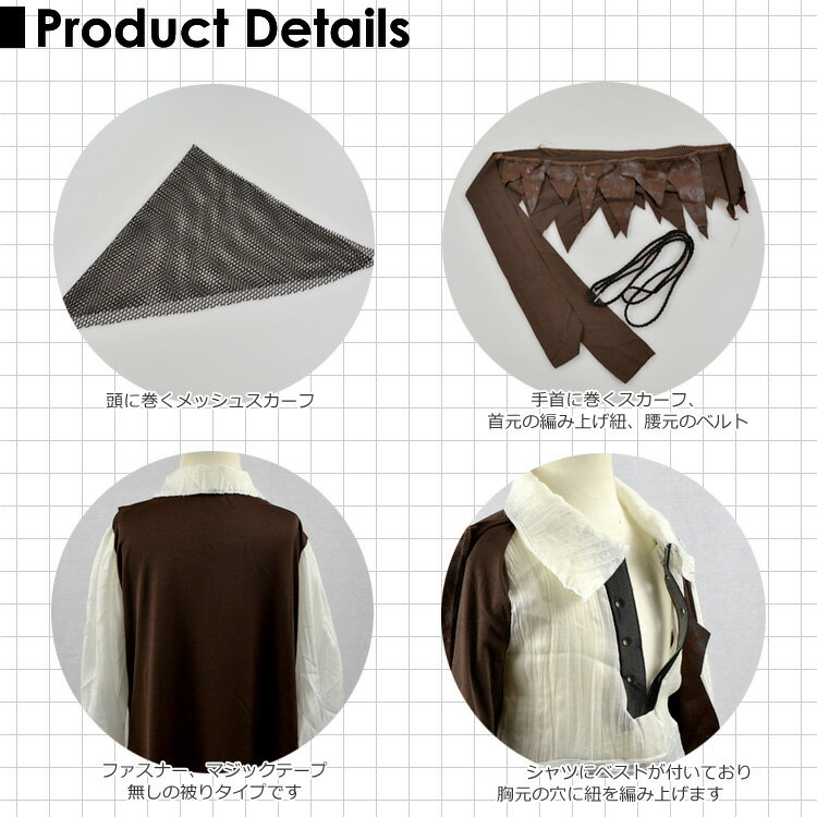 頭に巻くメッシュスカーフ、首元は紐を編み上げて頂き、腰元はベルトを巻いて頂きます ※100%ポリエステル ※セット内容 ・ベスト付きシャツ ・メッシュスカーフ ・ベルト モデル着用のその他衣装は含まれません。